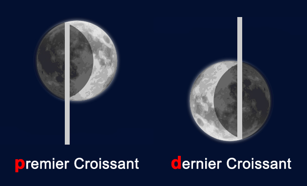 - Si l’ensemble forme un « d », alors vous êtes en période décroissante. Vous pouvez accentuer cette astuce en associant le D comme le diminutif du Dernier croissant.